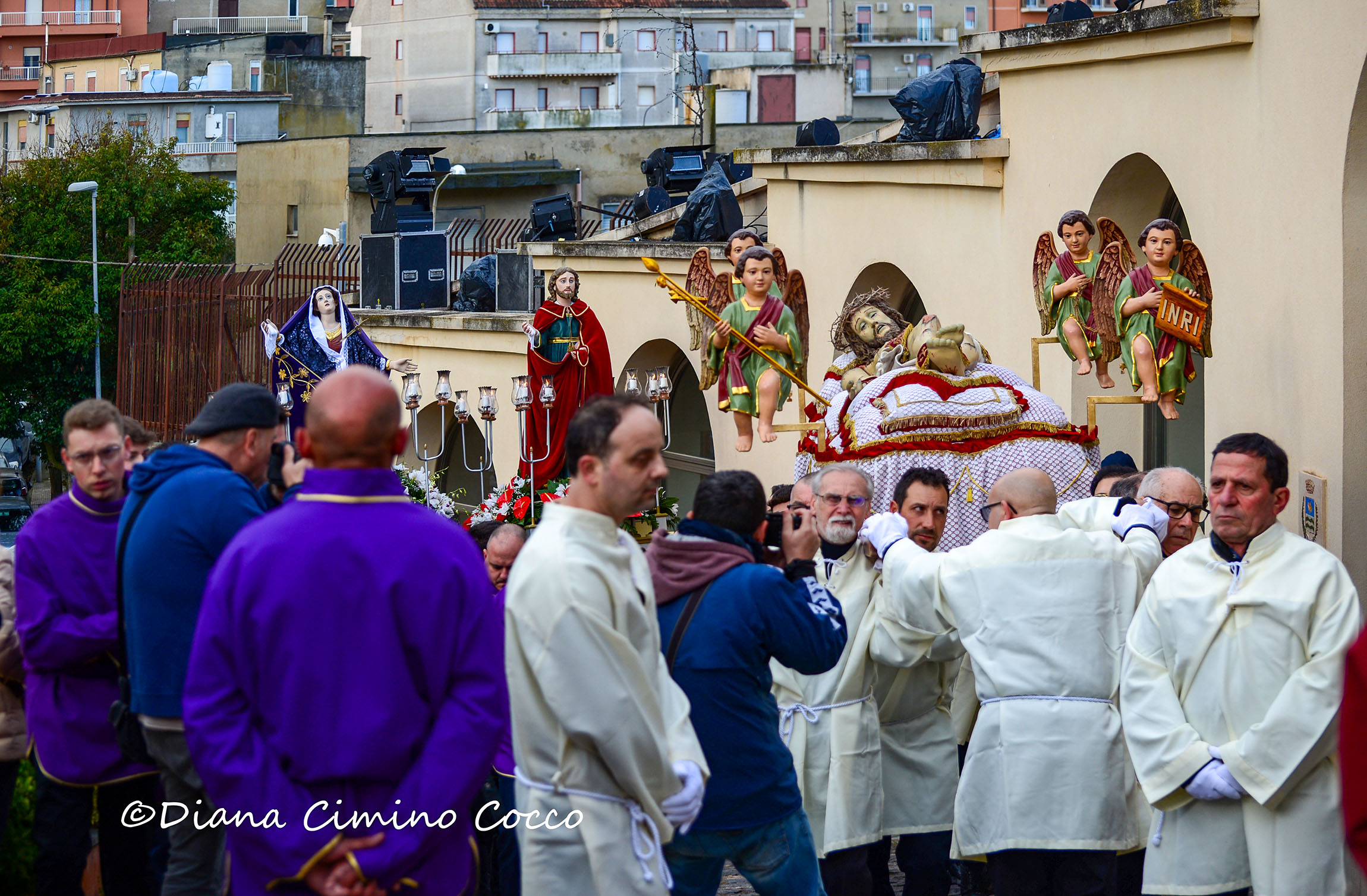 La sera del Venerdì Santo, alle 20.00, in piazza Calvario, la rappresentazione dal vivo della discesa di Gesù dalla croce, ”’a scinnenza” (foto nn. 1 – 7) e la deposizione nella Sacra Urna ha fortemente commosso tutti gli astanti. Infine, mentre l’Addolorata e San Giovanni rientravano nella chiesa di San Giuseppe, i fedeli e visitatori da fuori città hanno seguito l’Urna Sacra con il Cristo morto fino a Piazza Matrice (foto n. 8).
