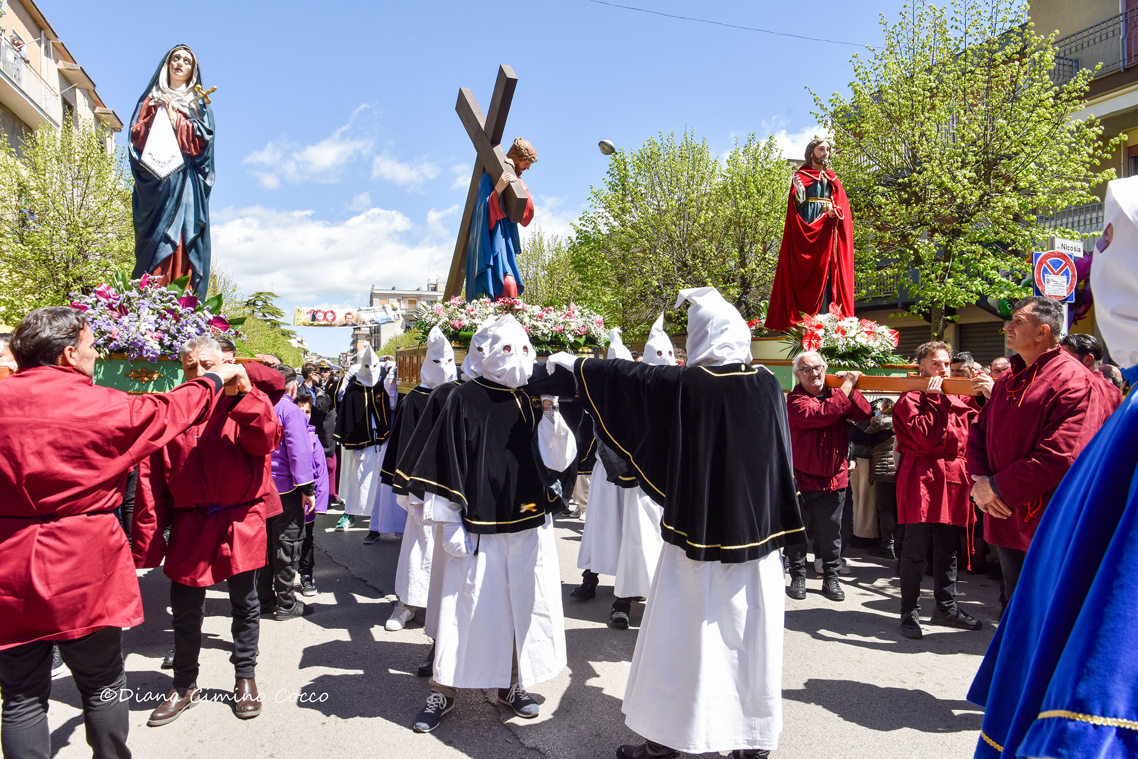 Il Venerdì Santo è cominciato con una folla enorme tra la chiesa di San Giuseppe e la chiesa Madre (foto nn2 – 3 -4). Qualche ora dopo in Corso Vittorio Emanuele e in piazza Papa Giovanni XXIII a San Cataldo si è svolto nuovamente l’incontro dell’Addolorata e San Giovanni con Cristo Morto. Per ”I Misteri”, in processione c’erano i gruppi statuari della Via Crucis realizzati dai fratelli Malecore alla fine dell’800. Le “vare” erano accompagnate dai figuranti che si dirigevano al Calvario dove era stato crocifisso Gesù. L’incontro, ”U n’ cuntru di mazzijunu”, è avvenuto a mezzogiorno, così come si leggeva sull’orologio del campanile della chiesa del SS. Rosario (foto nn. 5 – 6).